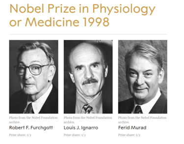Murad discovered that nitric oxide increases levels of cyclic GMP, a molecule involved in relaxing smooth muscle (e.g., in blood vessels). Murad, F., Gryglewski, R. J., Mitchell, J. A., & Moncada, S. (1977). Nitric oxide: A molecule with dual roles in the control of vascular tone. Molecular Pharmacology, 13(4), 739β748.